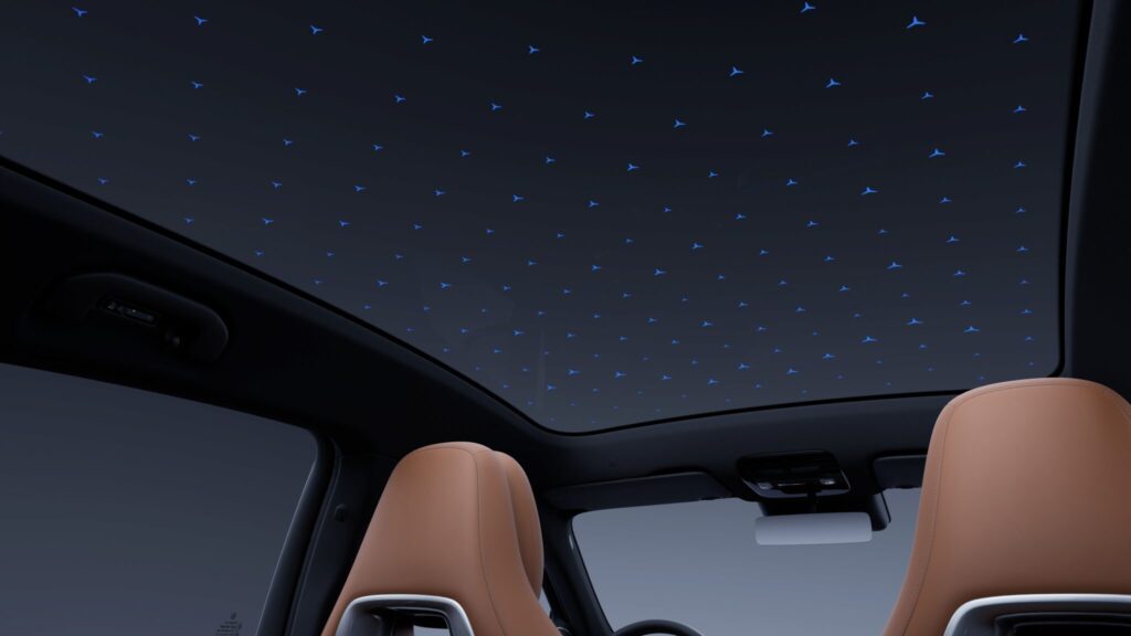 Un’attrazione particolare è il Mercedes-Benz Pattern illuminato nei tetti panoramici di alcune serie di modelli. Questo dispositivo estende l’illuminazione di atmosfera del veicolo alla superficie in vetro e la illumina in modo impressionante: a richiesta, la luce di oltre 150 Stelle Mercedes-Benz può essere proiettata sul vetro, offrendo un’esperienza visiva unica, soprattutto di notte, in particolare per i passeggeri posteriori.